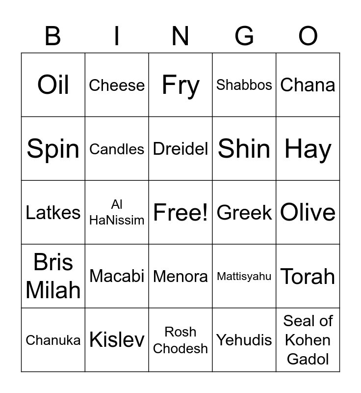 This bingo card has a free space and 33 words: 25th day, 8 days, Al HaNissim, Antiyochus, Bris Milah, Candles, Chana, Chanuka, Cheese, Donuts, Dreidel, Fry, Gelt, Gimmel, Greek, Hay, Kislev, Latkes, Macabi, Mattisyahu, Menora, Nun, Oil, Olive, Rosh Chodesh, Seal of Kohen Gadol, Shabbos, Shin, Spin, Torah, Yehuda, Yehudis and Kosher.
