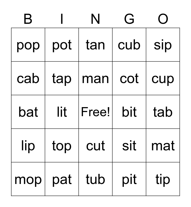 This bingo card has a free space and 24 words: top, pat, man, mop, sip, pop, cab, pot, bit, cut, cot, bat, sit, mat, tap, pit, tab, tan, cup, lit, tip, lip, cub and tub.