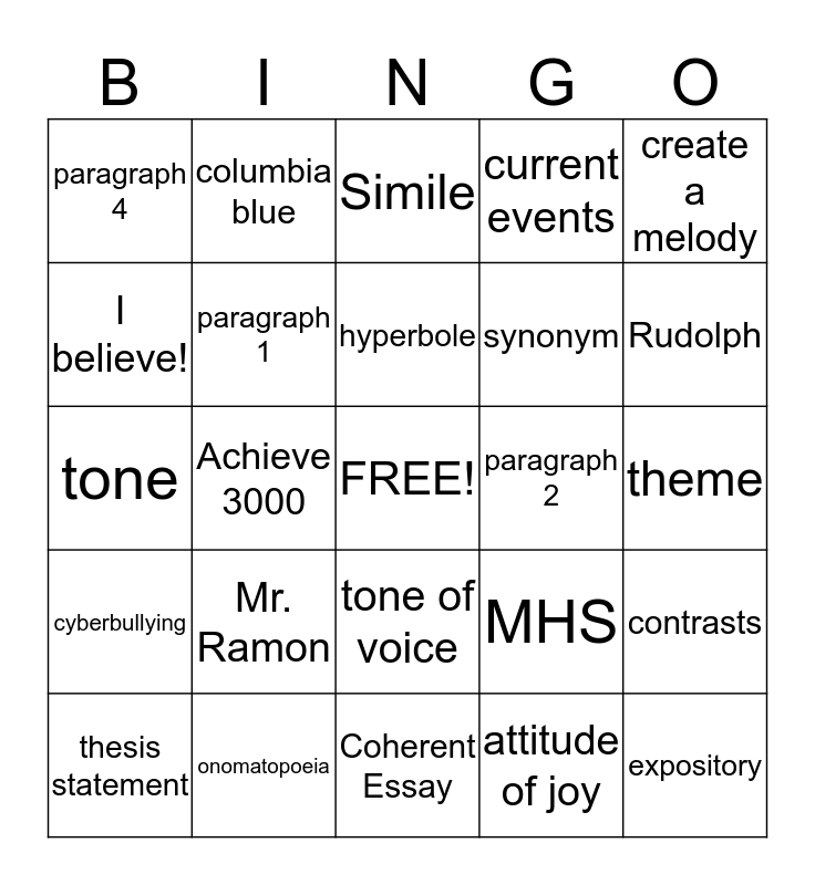 This bingo card has a free space and 84 words: connotation, dennotation, Simile, Triplet, Quatrain, noun, verb, metaphor, blackout poetry, stanza, authors purpose, antonym, paragraph 1, paragraph 2, paragraph 3, paragraph 4, thesis statement, I believe!, 2 examples, adjective, poetry, synonym, expository, essay, Achieve 3000, lexile level, articles, Merry Christmas, Candy Cane, Christmas Tree, Mr. Ramon, life experiences, mood, tone, setting, Christmas present, Coherent Essay, plot, Rudolph, cyberbullying, digital thumbprint, current events, imagery, meter, rhyme scheme, cuplets, columbia blue, scarlette red, 1955, spurs, literary devices, MHS, current events, Plainsmen Pride, figurative language, alliteration, onomatopoeia, hyperbole, personification, theme, lyric poetry, investigate an idea, evaluate evidence, clear ideas, comparing, two unlike things, like or as, repetition, create a melody, similarities, contrasts, mimic sounds, realistic feelings, exaggerated statement, tone of voice, attitude of joy, attitude of sadness, attitude of silliness, attitude of frustration, attitude of anger, introductory paragraph, personal emotions, personal feelings and musical expression.