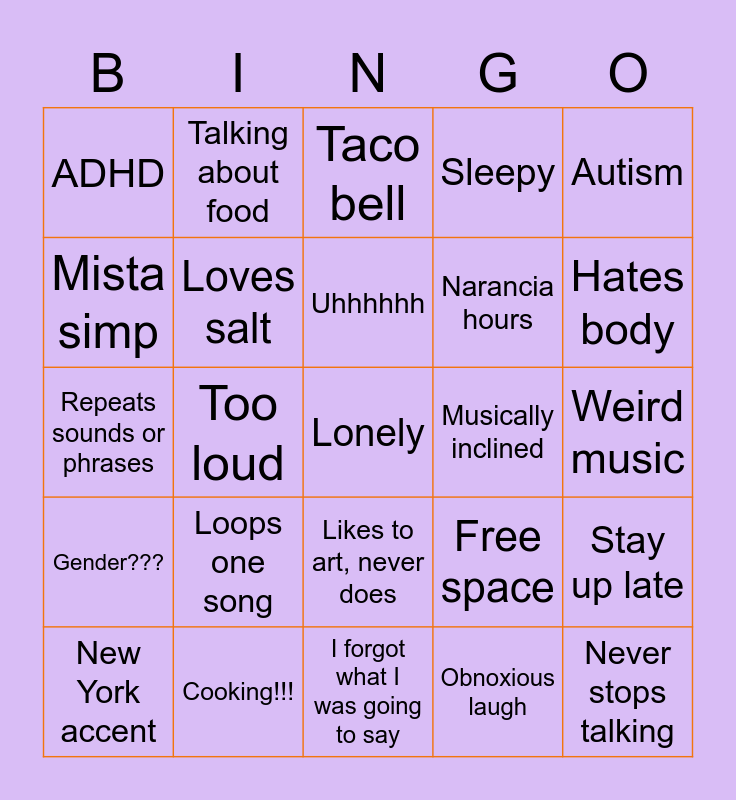 This bingo card has 25 words: Loops one song, I forgot what I was going to say, Uhhhhhh, New York accent, Autism, ADHD, Mista simp, Talking about food, Musically inclined, Likes to art, never does, Narancia hours, Repeats sounds or phrases, Free space, Stay up late, Loves salt, Never stops talking, Weird music, Taco bell, Hates body, Too loud, Lonely, Cooking!!!, Gender???, Sleepy and Obnoxious laugh.