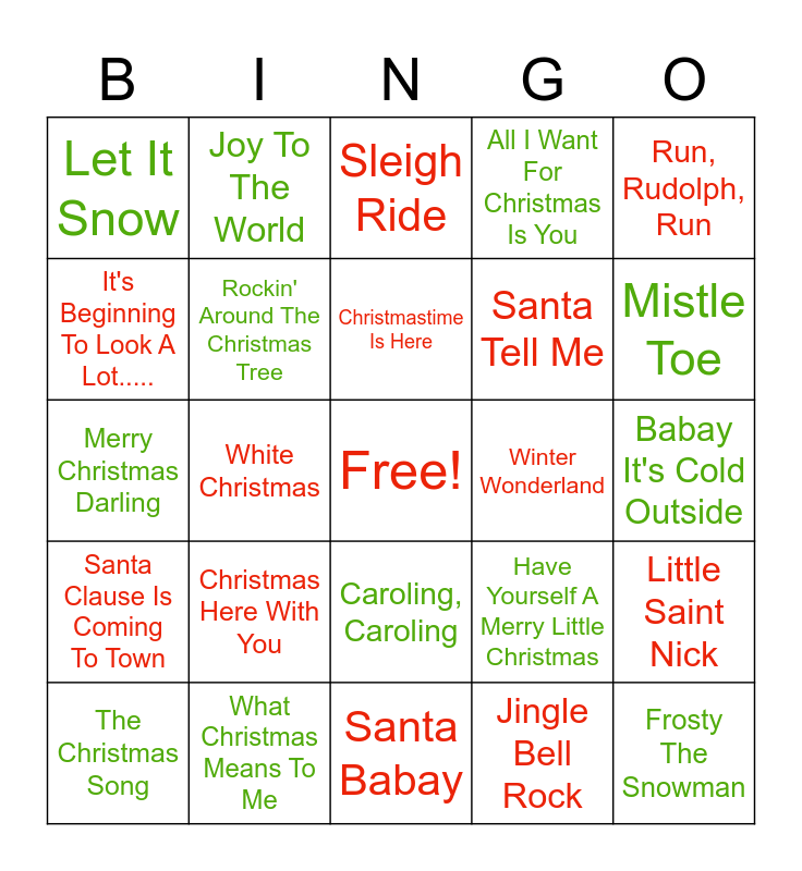This bingo card has a free space and 24 words: Christmas Here With You, What Christmas Means To Me, Christmastime Is Here, The Christmas Song, Run, Rudolph, Run, Let It Snow, It's Beginning To Look A Lot....., Joy To The World, Winter Wonderland, Caroling, Caroling, Santa Tell Me, Merry Christmas Darling, Have Yourself A Merry Little Christmas, Little Saint Nick, Rockin' Around The Christmas Tree, Jingle Bell Rock, Babay It's Cold Outside, Sleigh Ride, Mistle Toe, White Christmas, Frosty The Snowman, Santa Clause Is Coming To Town, All I Want For Christmas Is You and Santa Babay.