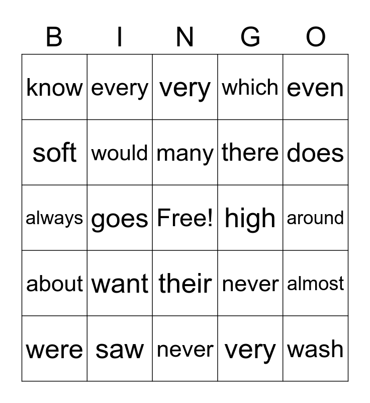 This bingo card has a free space and 24 words: want, saw, many, were, even, know, soft, every, high, their, there, always, never, almost, would, very, around, very, does, goes, wash, about, which and never.
