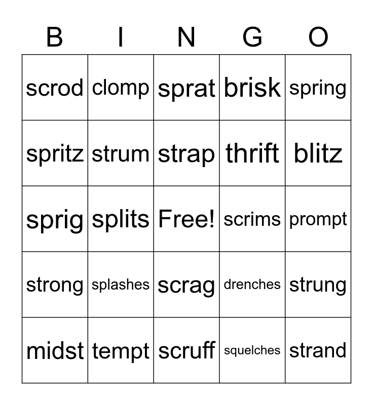 This bingo card has a free space and 29 words: midst, prompt, splits, scrap, scrod, sprat, strum, splashes, scrims, tempt, prompt, strand, scruff, squelches, blitz, struck, scrag, strong, spring, sprig, drenches, prongs, thrift, spritz, brisk, clomp, strung, strap and sculpt.