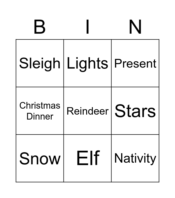This bingo card has 15 words: Tree, Father Christmas, Present, Sleigh, Elf, Reindeer, Angel, Snowman, Stars, Nativity, Christmas Cake, Christmas Dinner, Snow, Lights and Advent.