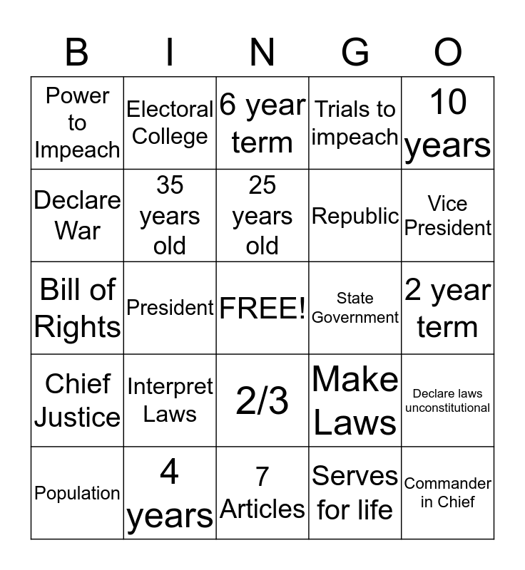 This bingo card has a free space and 24 words: Interpret Laws, 4 years, 25 years old, Population, 10 years, Power to Impeach, Declare War, Electoral College, State Government, 2/3, Republic, Bill of Rights, Make Laws, Declare laws unconstitutional, 35 years old, Serves for life, 2 year term, 6 year term, Vice President, President, Commander in Chief, Chief Justice, Trials to impeach and 7 Articles.