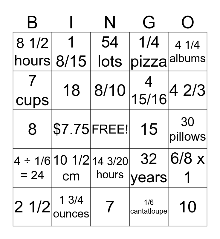 This bingo card has a free space and 24 words: 10 1/2 cm, 1 3/4 ounces, 8/10, 2 1/2, 4 1/4 albums, 8 1/2 hours, 7 cups, 1 8/15, 15, 14 3/20 hours, 4 15/16, 8, 32 years, 6/8 x 1, 18, 1/6 cantatloupe, 30 pillows, 54 lots, 4 2/3, $7.75, 10, 4 ÷ 1/6 = 24, 1/4 pizza and 7.