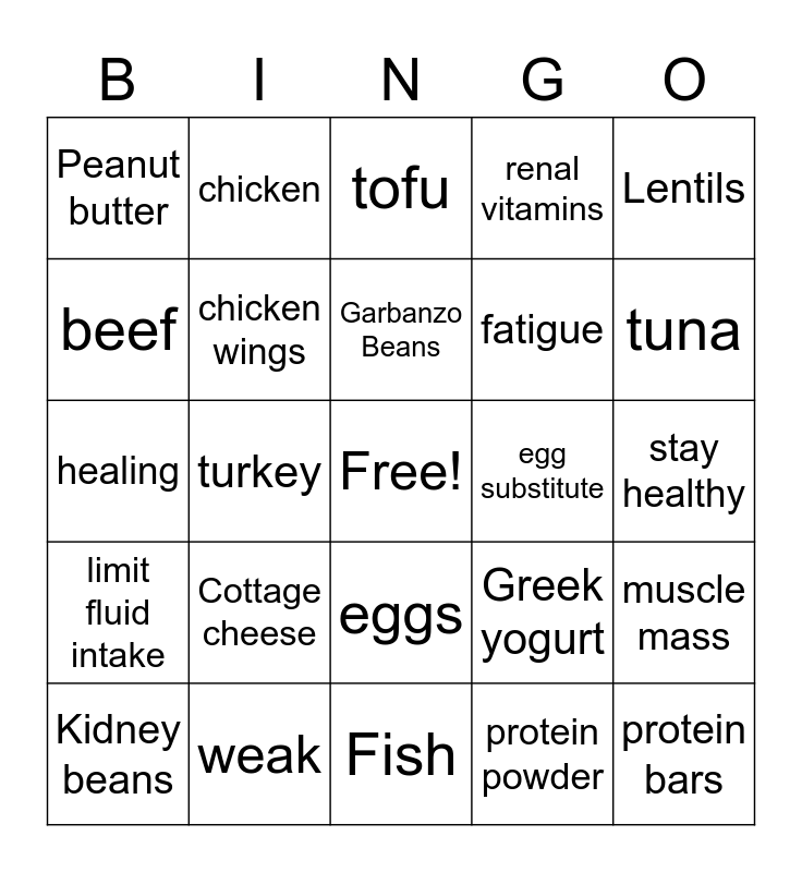 This bingo card has a free space and 25 words: Cottage cheese, Fish, Garbanzo Beans, Kidney beans, Lentils, Peanut butter, beef, chicken, egg substitute, eggs, fatigue, healing, Greek yogurt, muscle mass, chicken wings, salmon, stay healthy, tofu, tuna, turkey, protein bars, weak, limit fluid intake, renal vitamins and protein powder.