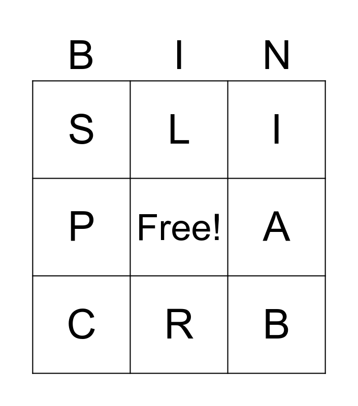 This bingo card has a free space and 8 words: A, I, L, C, S, B, P and R.