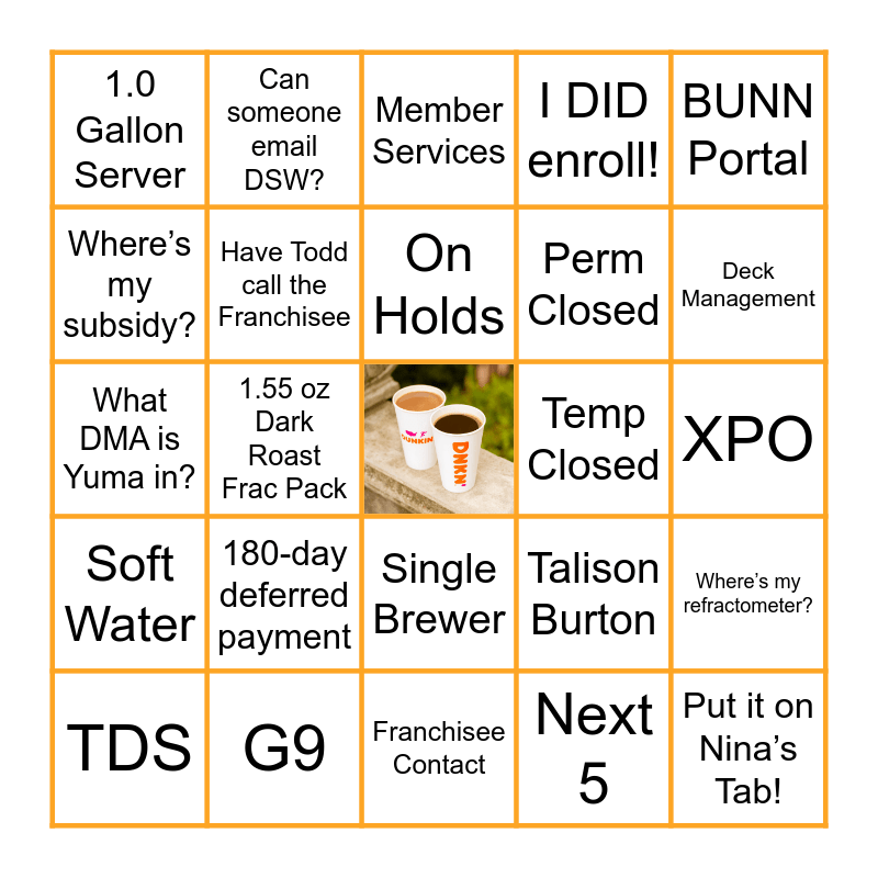 This bingo card has a free space and 44 words: Non-NDCP Member, Put it on Nina’s Tab!, 50 AMP Breaker, TDS, Partstown, Next 5, Member Services, Need Credit Card Info, BUNN Portal, G9, I DID enroll!, Temp Closed, Single Brewer, 180-day deferred payment, HVB Inbox, Franchisee Contact, Can’t make this $hit Up, What DMA is Yuma in?, Twin Brewer, Deck Management, Can someone email DSW?, Did I get roll out pricing?, Pull forward Arizona, 1.0 Gallon Server, MHG Generic Motherboard v 3.19, XPO, Deferred Remodel, Blue Blinking Lights, Talison Burton, Soft Water, Let me check with Finance, Where’s my refractometer?, Self-Install, Big 3, 1.55 oz Dark Roast Frac Pack, Member Services, Server Magnets, BUNN, On Holds, Where’s my subsidy?, Perm Closed, Grind Weights, Have Todd call the Franchisee and What’s the SKU#?.