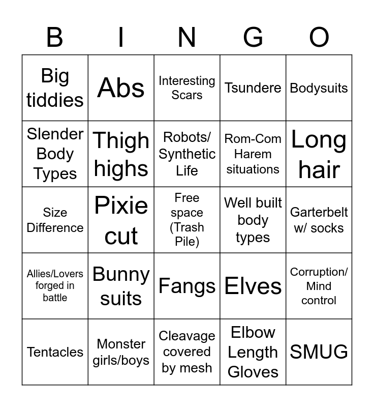 This bingo card has a free space and 24 words: Bunny suits, Monster girls/boys, Robots/ Synthetic Life, Tentacles, Bodysuits, Big tiddies, Slender Body Types, Abs, Well built body types, Fangs, Rom-Com Harem situations, Size Difference, Elves, Corruption/ Mind control, Thigh highs, Elbow Length Gloves, Garterbelt w/ socks, Interesting Scars, Long hair, Pixie cut, SMUG, Allies/Lovers forged in battle, Tsundere and Cleavage covered by mesh.