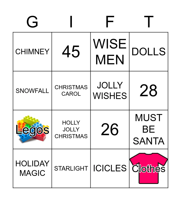 This bingo card has 15 images and 300 words: Books, Silver, Clothes, Blanket, Legos, Candy, Blue, Toys, Red, Green, White, Electronics, Food, Gift Card, Games, Money, CAMEL, CANDLES, CANDY CANE, CAROL, CAROL OF THE BELLS, CAROLER, CEDAR, CELEBRATION, CHARLIE BROWN CHRISTMAS, CHEER, CHESTNUTS, CHIMNEY, CHIPMUNK CHRISTMAS, CHISTMAS SALES, CHRISTMAS, CHRISTMAS CARD, CHRISTMAS CAROL, CHRISTMAS COOKIE, CHRISTMAS DAY, CHRISTMAS DINNER, CHRISTMAS EVE, CHRISTMAS FOR COWBOYS, CHRISTMAS FUTURE, CHRISTMAS GIFT, CHRISTMAS LIGHTS, CHRISTMAS MIRACLE, CHRISTMAS MONEY, CHRISTMAS MORNING, CHRISTMAS PAGEANT, CHRISTMAS PLAY, CHRISTMAS PRESENT, CHRISTMAS STAR, CHRISTMAS STORY, CHRISTMAS TREE, CHRISTMAS WISH, CRANBERRY SAUCE, DECEMBER, DECEMBER 25TH, DECK THE HALLS, DECORATIONS, DO YOU HEAR WHAT I HEAR?, DOLLS, DR. SEUSS’ HOW THE GRINCH STOLE CHRISTMAS, DRESSING, DRUMMER BOY, EGGNOG, ELF, ELF, ELVES, ERNEST SAVES CHRISTMAS, FAMILY, FAMILY GATHERING, FAMILY REUNION, FEAST, FELIZ NAVIDAD, FESTIVAL, FIGGY PUDDING, FIR, FIRST NOEL, FRESH SNOWFALL, FROSTY, FROSTY RETURNS, FROSTY THE SNOWMAN, FROSTY’S WINTER WONDERLAND, FRUITCAKE, GALA, GATHERING, GIFT BOXES, GIFT EXCHANGE, GIFT LIST, GIFTS, GINGERBREAD HOUSE, GLAD TIDINGS, GOOD LUCK CHARLIE, IT’S CHRISTMAS! (2011), GOODWILL, GRANDMA GOT RUN OVER BY A REINDEER, GREATEST GIFT OF ALL, GREETINGS, GRINCH, HALLELUJAH CHORUS, HARK! THE HERALD ANGELS SING, HAVE YOURSELF A MERRY LITTLE CHRISTMAS, HOLIDAY, HOLIDAY CELEBRATION, HOLIDAY CHEER, HOLIDAY CLASSIC, HOLIDAY FAVORITE, HOLIDAY GALA, HOLIDAY GREETINGS, HOLIDAY MAGIC, HOLIDAY PARTY, HOLIDAY SPIRIT, HOLIDAY TIDINGS, HOLIDAY TRADITION, HOLLY, HOLLY JOLLY CHRISTMAS, HOME, HOME ALONE, I SAW MOMMY KISSING SANTA CLAUS, ICICLES, I'LL BE HOME FOR CHRISTMAS, IT’S A VERY MERRY MUPPET CHRISTMAS MOVIE, IT’S A WONDERFUL LIFE, IT'S BEGINNING TO LOOK LIKE CHRISTMAS, IT'S THE MOST WONDERFUL TIME OF THE YEAR, JACK FROST, JINGLE BELL ROCK, JINGLE BELLS, JOLLY WISHES, JOY, JOY TO THE WORLD, KRISS KRINGLE, LET IT SNOW, LETTER TO SANTA, LUMP OF COAL, MARY, MASS, MENORAH, MICKEY’S CHRISTMAS CAROL, MIDNIGHT SERVICE, MINCE PIE, MIRACLE, MIRACLE OF CHRISTMAS, MIRACLE ON 34TH STREET, MISTLETOE, MR. GRINCH, MRS. CLAUS, MUPPET FAMILY CHRISTMAS, MUST BE SANTA, NATIONAL LAMPOON’S CHRISTMAS VACATION, NATIVITY SCENE, NOEL, NUTCRACKER, O CHRISTMAS TREE, O COME, ALL YE FAITHFUL, O HOLY NIGHT, OFFICE CHRISTMAS PARTY, ORNAMENT, OVER THE RIVER AND THROUGH THE WOODS, PARADE, PEACE, PEACE DOVE, NORTH POLE, PEPPERMINT, PINE, PLUMS, POINSETTIA, PRAYER, PRESENTS, REINDEER, RIBBON, ROARING FIRE, ROCKING AROUND THE CHRISTMAS TREE, ROOFTOP, RUDOLPH, SALES, SANTA, SANTA BABY, SANTA CLAUS IS COMIN’ TO TOWN, SANTA'S BAG, SANTA'S ELVES, SANTA'S LIST, SANTA'S SLEIGH, SANTA'S WORKSHOP, SCROOGE, SEASON, SEASON'S GREETINGS, SECRET SANTA, SERVICE, SHEPHERD, SHOPPING, SHREK THE HALLS, SILENT NIGHT, SILVER BELLS, SLED, SLEIGH, SLEIGH BELLS, SLEIGH RIDE, SNOW, SNOW ANGEL, SNOWFALL, SNOWFLAKE, SNOWMAN, SPIRIT, ST. NICK, STAR, STARLIGHT, STOCKING, STOCKING STUFFER, STROKE OF MIDNIGHT, SUGAR PLUMS, THE ENCHANTED CHRISTMAS, THE MUPPET CHRISTMAS CAROL, THE NIGHT BEFORE CHRISTMAS, THIS IS THAT TIME OF THE YEAR, TIDING, TINSEL, TOYS, TRADITION, TREE STAND, TRIMMINGS, TRUMPETS, TURKEY, TWAS THE NIGHT BEFORE CHRISTMAS, TWELVE DAYS OF CHRISTMAS, UP ON THE HOUSETOP, VISIONS OF SUGARPLUMS, WE WISH YOU A MERRY CHRISTMAS, WHITE CHRISTMAS, WINTER, WINTER WONDERLAND, WISE MEN, WRAPPING PAPER, WREATH, XMAS, YOUR HOLIDAY BEST, YULE LOG, 1, 2, 3, 4, 5, 6, 7, 8, 9, 10, 11, 12, 13, 14, 15, 16, 17, 18, 19, 20, 21, 22, 23, 24, 25, 26, 27, 28, 29, 30, 31, 33, 34, 35, 36, 37, 38, 39, 40, 41, 42, 32, 43, 44, 45, 46, 47, 48, 49, 50, 51, 52, 53, 54, 55, 56, 57, 58, 59, 60, 61, 62, 63, 64, 65, 66 and 67.