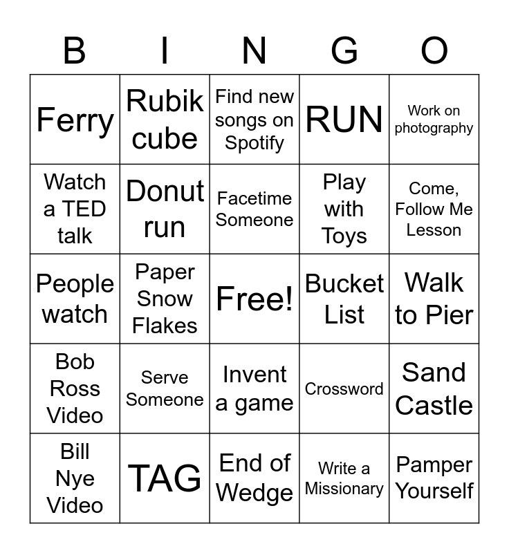 This bingo card has a free space and 24 words: Serve Someone, TAG, Facetime Someone, Bill Nye Video, Work on photography, Ferry, Watch a TED talk, Rubik cube, Bucket List, Invent a game, Play with Toys, People watch, Crossword, Sand Castle, Donut run, Write a Missionary, Walk to Pier, Find new songs on Spotify, Come, Follow Me Lesson, Paper Snow Flakes, Pamper Yourself, Bob Ross Video, RUN and End of Wedge.