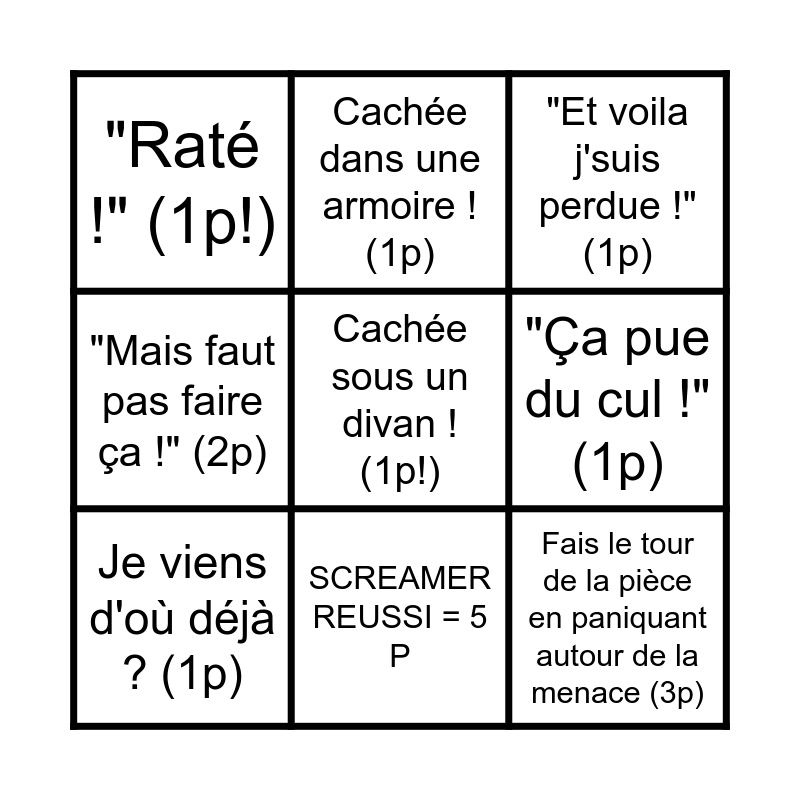 This bingo card has 9 words: Je viens d'où déjà ? (1p), "Et voila j'suis perdue !" (1p), Cachée dans une armoire ! (1p), "Mais faut pas faire ça !" (2p), "Raté !" (1p!), "Ça pue du cul !" (1p), Cachée sous un divan ! (1p!), Fais le tour de la pièce en paniquant autour de la menace (3p) and SCREAMER REUSSI = 5 P.