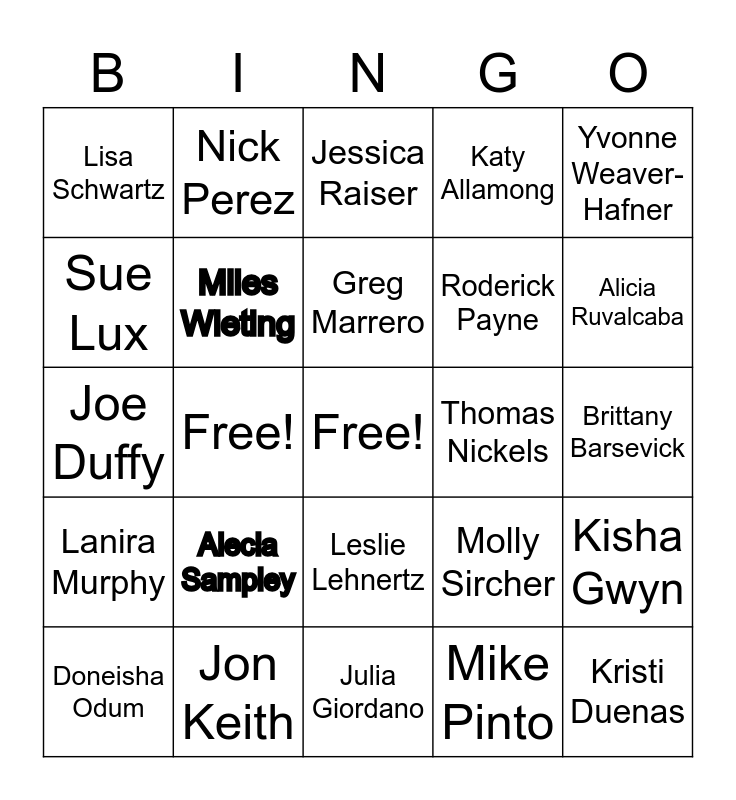 This bingo card has a free space and 24 words: Alecia Sampley, Jon Keith, Greg Marrero, Doneisha Odum, Yvonne Weaver-Hafner, Lisa Schwartz, Sue Lux, Nick Perez, Thomas Nickels, Leslie Lehnertz, Roderick Payne, Joe Duffy, Molly Sircher, Kisha Gwyn, Miles Wieting, Mike Pinto, Brittany Barsevick, Jessica Raiser, Alicia Ruvalcaba, Free!, Kristi Duenas, Lanira Murphy, Katy Allamong and Julia Giordano.