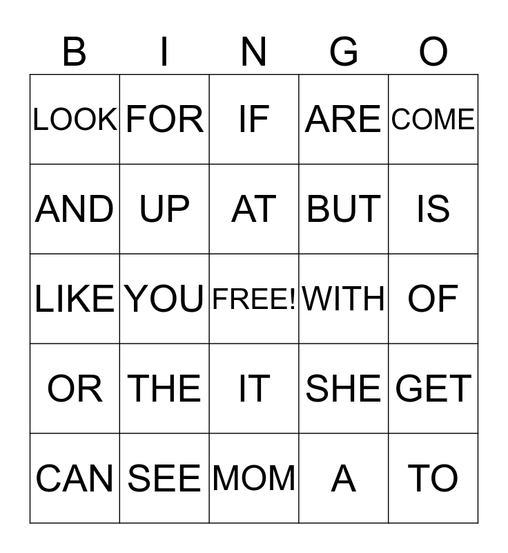 This bingo card has a free space and 24 words: THE, SEE, AT, CAN, COME, LOOK, AND, FOR, WITH, IT, BUT, LIKE, SHE, GET, UP, A, OF, IF, IS, YOU, TO, OR, ARE and MOM.
