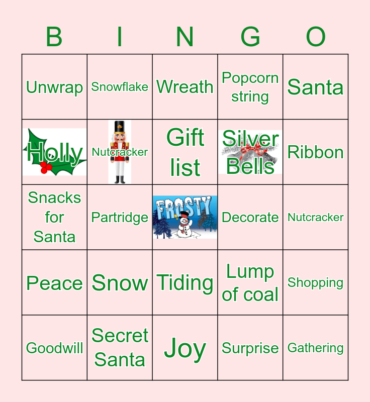 This bingo card has 18 images, a free space and 177 words: Stockings, Holiday, Holly, Wreath, Elf, Winter, Sleigh, Noel, Silver Bells, Snowflake, Nutcracker, Reindeer, Carol, Candy cane, Joy, Cookie, Gifts, Tiding, Star, Santa, Chimney, Holiday, Winter, Cold, Snow, Holiday card, Holiday carol, Holiday cookie, Hot cocoa, Celebration, Presents, Lights, Bright, Holiday Magic, Dream, Sweets, Holiday present, Star, Holiday tree, Wish, December, The Night Before Christmas, Decorations, A Christmas Story, Ebenezer, Eggnog, Elf, Family, Family gathering, Grateful, Feast, festival, Wonder, Toboggan, fresh snowfall, Frosty, Fruitcake, Gathering, Gift exchange, Gift list, Gifts, Gingerbread house, Glad tidings, Shopping, Holiday Food, Goodwill, Greetings, Grinch, Ham, Holiday cheer, Holiday classic, Holiday favorite, Rudolph, Holiday greetings, Holiday magic, Holiday merriment, Holiday party, Holiday spirit, Holiday tidings, Holiday tradition, Holly, Holly berry, Celebration, Travel, Home, Pine cones, Package, Debt, Partridge, Jingle bells, Jolly wishes, Love, Joy, Heart, Letter to Santa, Lump of coal, Mittens, Surprise, Icicle, Hot cider, Merriment, Giving, Mince pie, Miracle, Friends, Mistletoe, Mrs. Claus, Fruitcake, Bow, Evergreen, Festive, Noel, North Pole, Nutcracker, Chestnuts, Parade, Peace, Ice skates, Peppermint, Pine, plums, Poinsettia, Jolly, Shiny, Reason for the season, Reindeer, Popcorn string, Ribbon, Roaring fire, Rooftop, Ornament, Santa, Santa's bag, Santa's elves, Santa's list, Santa's sleigh, Santa's workshop, Unwrap, Scrooge, Season's greetings, Secret Santa, Shopping, Silver bells, Sled, Sleigh, Sleigh bells, Snacks for Santa, Cozy, Snowfall, Snowflake, Snowman, Blizzard, Scarf, Toy, Decorate, Peppermint, Stocking, Stocking stuffer, Stroke of midnight, Sugar plums, Tree skirt, Tiding, Tinsel, Toys, Tradition, Tree stand, Trimmings, Trumpets, Turkey, Visions of sugarplums, Winter, Winter wonderland, Frost, Baubles, Wrapping paper, Wreath and Pie.