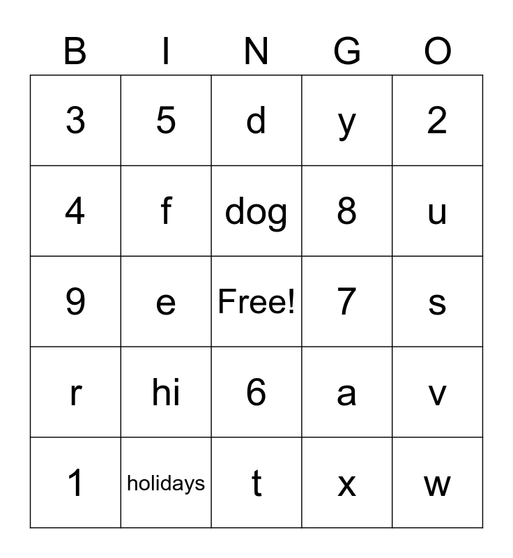 This bingo card has a free space and 24 words: hi, holidays, dog, 1, 2, 3, 4, 5, 7, 6, 8, 9, a, v, f, x, s, d, u, e, w, r, y and t.