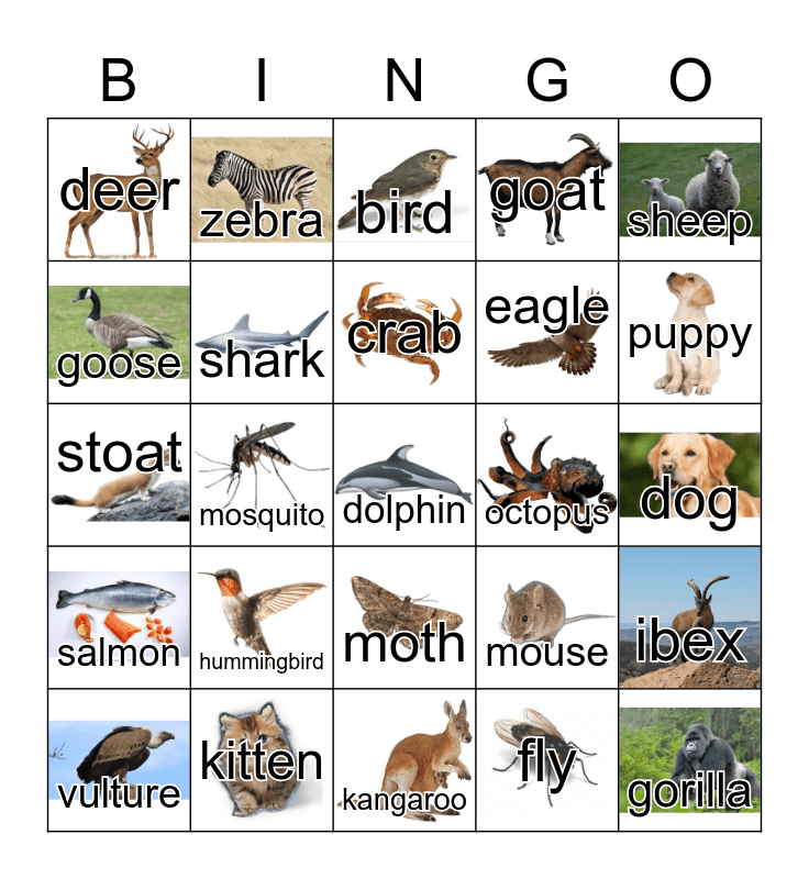 This bingo card has 95 images and 95 words: elephant, bat, fly, bee, bear, koala bear, butterfly, kitten, giraffe, shells, goldfish, cheetah, cow, crab, cat, deer, puppy, dragonfly, worms, duck-billed platypus, sponges, weasel, fox, frog, goat, goose, ostriches, eagle, hen, horse, hummingbird, whale, jellyfish, killer whale, vulture, ladybird, kangaroo, ducks, stoat, chimpanzee, ibex, mosquito, moth, sheep, mouse, octopus, tortoise, owl, pig, hippopotamus, rabbit, raccoon, gorilla, tiger, lizard, fish, robin, otter, scorpion, seal, shark, snail, snake, spider, squirrel, starfish, panda, swan, bird, turkey, lion, walrus, dolphin, wolf, camel, lobster, alligator, ant, monkey, zebra, rat, hamster, turtle, crocodile, dog, salmon, polar bears, salamander, newt, humans, chameleon, pigeon, leopard, swallow and sparrow.
