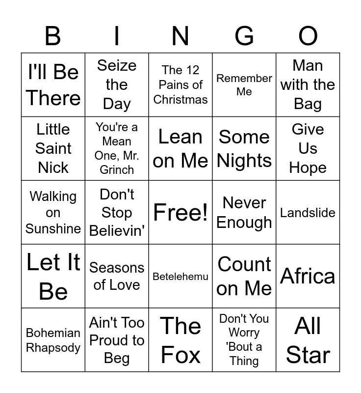 This bingo card has a free space and 24 words: Seasons of Love, Ain't Too Proud to Beg, Lean on Me, Bohemian Rhapsody, Man with the Bag, I'll Be There, Little Saint Nick, Seize the Day, Never Enough, Betelehemu, Some Nights, Walking on Sunshine, Count on Me, Africa, You're a Mean One, Mr. Grinch, Don't You Worry 'Bout a Thing, Landslide, The 12 Pains of Christmas, Give Us Hope, Don't Stop Believin', All Star, Let It Be, Remember Me and The Fox.