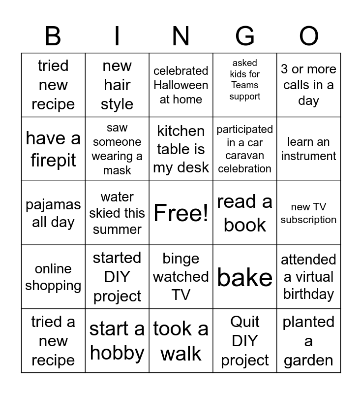 This bingo card has a free space and 55 words: back-to-back video calls, tried a new recipe, bought exercise equipment, tried new recipe, took a walk, got a pet, saw someone wearing a mask, video call with friends, participated in a car caravan celebration, online fitness class, asked kids for Teams support, video games, been to EXIM building, passed by EXIM building, made sourdough, used exercise equipment, 3 or more calls in a day, water skied this summer, talked to plants, planted a garden, read a book, watched a movie, bake, celebrated Halloween at home, dog barked on call, kitchen table is my desk, Quit DIY project, got a new bike, new TV subscription, attended a virtual birthday, have a tent, missing office buddies, hike, talked with mic on mute, have a firepit, pajamas all day, hired during quarantine, online shopping, puzzle, changed roles during quarantine, new hair style, tackled a cleaning project, bike ride, working at a desk, started DIY project, start a hobby, saw your child off to college, traveled somewhere, bought plants, learn an instrument, donated to CFC, attended a virtual wedding, reorganized the spice rack, binge watched TV and washed my hands in the last hour.
