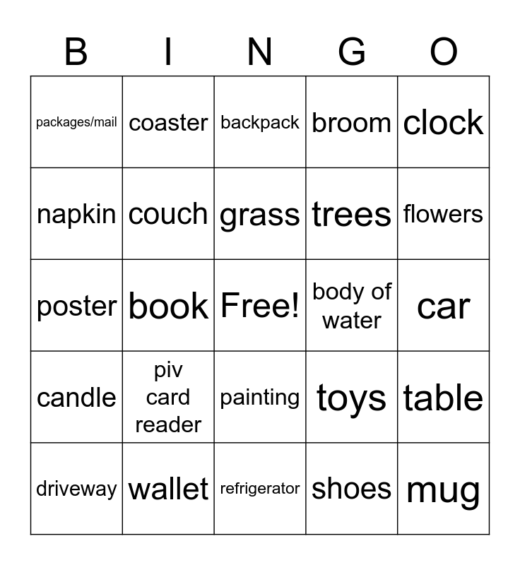 This bingo card has a free space and 52 words: window, mug, lamp, refrigerator, piv card reader, computer mouse, coaster, plate, napkin, pen, couch, TV, table, toys, tablets, piano, grass, body of water, fireplace, clock, book, shoes, packages/mail, trees, people outside, cell phone, pet food bowl, mirror, flowers, plants, stool, broom, carpet, coffee table, shelf, backpack, wallet, frontdoor, backdoor, stairs, garage, car, candle, picture frame, painting, bookshelf, map, poster, water bottle, neighbor, driveway and kids playing outside.