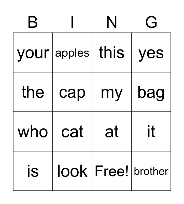 This bingo card has 17 words: Free!, is, this, your, cat, yes, it, my, bag, cap, look, at, the, apples, who, he and brother.