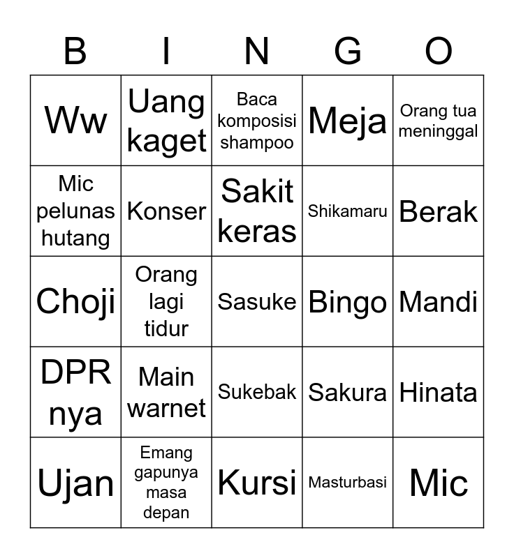 This bingo card has a free space and 24 words: Main warnet, Emang gapunya masa depan, Sakit keras, Ujan, Orang tua meninggal, Ww, Mic pelunas hutang, Uang kaget, Bingo, Sukebak, Shikamaru, Choji, Sakura, Hinata, Konser, Masturbasi, Mandi, Baca komposisi shampoo, Berak, Orang lagi tidur, Mic, DPR nya, Meja and Kursi.
