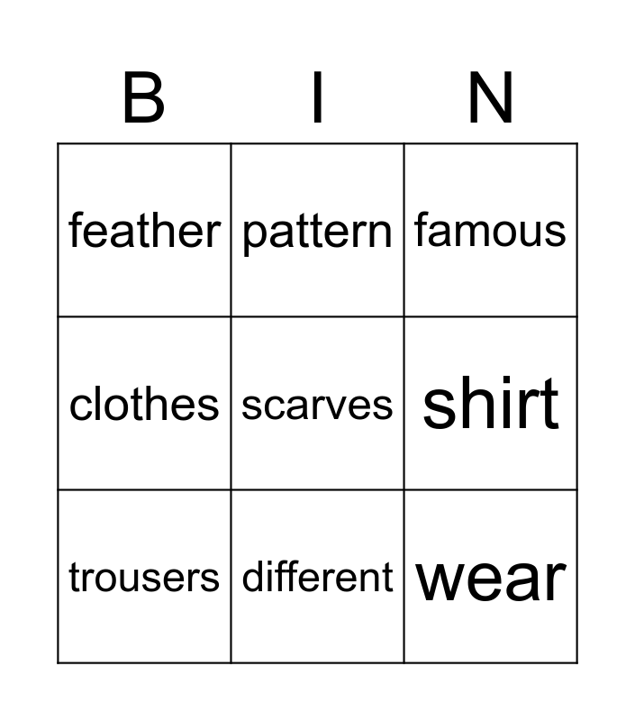 This bingo card has a free space and 8 words: shirt, famous, pattern, trousers, feather, wear, clothes and different.