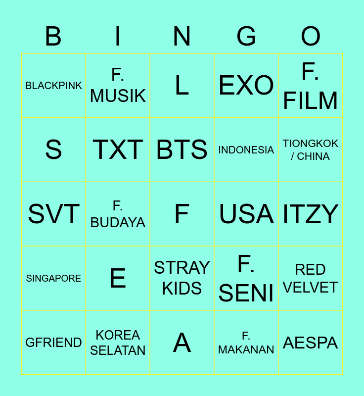 This bingo card has a free space and 24 words: E, KOREA SELATAN, BTS, GFRIEND, F. FILM, BLACKPINK, S, F. MUSIK, USA, STRAY KIDS, INDONESIA, SVT, F. SENI, RED VELVET, TXT, F. MAKANAN, ITZY, L, TIONGKOK / CHINA, F. BUDAYA, AESPA, SINGAPORE, EXO and A.