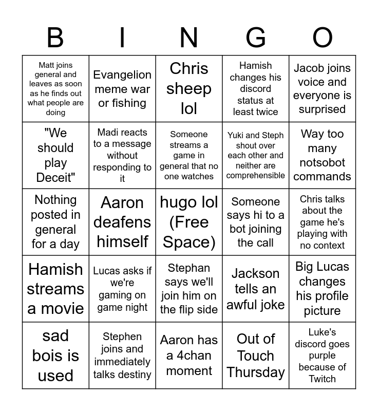 This bingo card has a free space and 24 words: Lucas asks if we're gaming on game night, Stephen joins and immediately talks destiny, Someone streams a game in general that no one watches, sad bois is used, Jacob joins voice and everyone is surprised, Matt joins general and leaves as soon as he finds out what people are doing, "We should play Deceit", Evangelion meme war or fishing, Someone says hi to a bot joining the call, Stephan says we'll join him on the flip side, Yuki and Steph shout over each other and neither are comprehensible, Nothing posted in general for a day, Jackson tells an awful joke, Big Lucas changes his profile picture, Madi reacts to a message without responding to it, Out of Touch Thursday, Chris talks about the game he's playing with no context, Chris sheep lol, Way too many notsobot commands, Aaron deafens himself, Luke's discord goes purple because of Twitch, Hamish streams a movie, Hamish changes his discord status at least twice and Aaron has a 4chan moment.