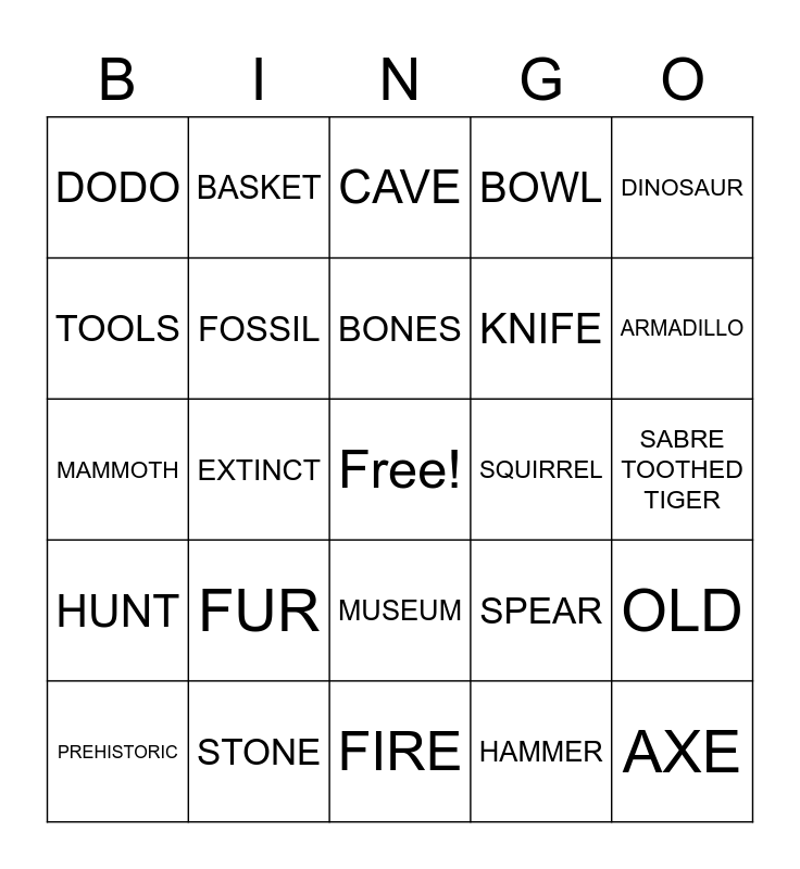 This bingo card has a free space and 24 words: FUR, STONE, BONES, PREHISTORIC, DINOSAUR, DODO, TOOLS, BASKET, SQUIRREL, MUSEUM, KNIFE, MAMMOTH, SPEAR, OLD, FOSSIL, HAMMER, SABRE TOOTHED TIGER, CAVE, ARMADILLO, EXTINCT, AXE, HUNT, BOWL and FIRE.