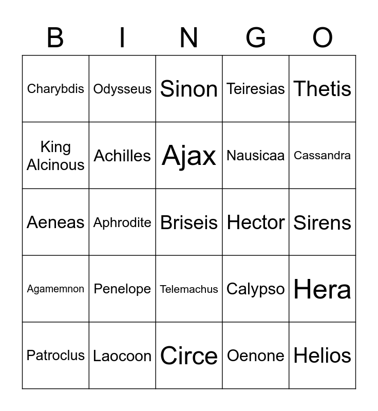 This bingo card has a free space and 34 words: Paris, Oenone, Helen, Menelaus, Agamemnon, Achilles, Thetis, Patroclus, Odysseus, Iphigenia, Ajax, Sinon, Priam, Hecuba, Hector, Cassandra, Laocoon, Aeneas, Penelope, Calypso, Telemachus, Scylla, Charybdis, Sirens, Circe, Helios, Teiresias, Polyphemus, Nausicaa, King Alcinous, Aeolus, Aphrodite, Hera and Athena.