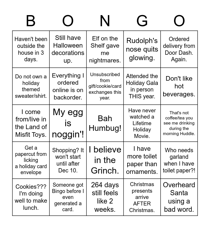 This bingo card has a free space and 24 words: Shopping? It won't start until after Dec 10., Someone got Bingo before I even generated a card., Unsubscribed from gift/cookie/card exchanges this year., Cookies??? I'm doing well to make lunch., Ordered delivery from Door Dash. Again., Haven't been outside the house in 3 days., Do not own a holiday themed sweater/shirt., Still have Halloween decorations up., Have never watched a Lifetime Holiday Movie., I believe in the Grinch., Attended the Holiday Gala in person THIS year., I come from/live in the Land of Misfit Toys., I have more toilet paper than ornaments., Who needs garland when I have toilet paper?!, Everything I ordered online is on backorder., Christmas presents arrive AFTER Christmas., That's not coffee/tea you see me drinking during the morning Huddle., Elf on the Shelf gave me nightmares., Don't like hot beverages., My egg is noggin'!, Overheard Santa using a bad word., Get a papercut from licking a holiday card envelope, Rudolph's nose quits glowing. and 264 days still feels like 2 weeks..