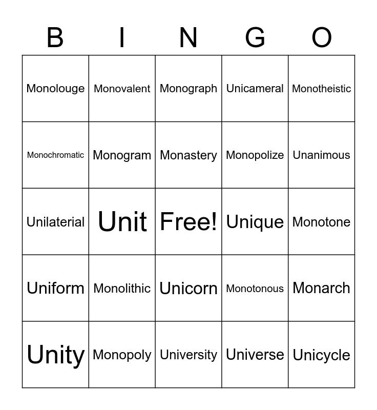 This bingo card has a free space and 29 words: Unity, Unitarian, Unit, Monochrome, Monolouge, Monograph, Monogram, Monolithic, Unique, Monopoly, Monotone, Unicycle, University, Universe, Unanimous, Reunion, Unicorn, Uniform, Monotheistic, Unilaterial, Monotonous, Monophonic, Monopolize, Monochromatic, Unicameral, Monovalent, Monarch, Monastery and Unicycle.