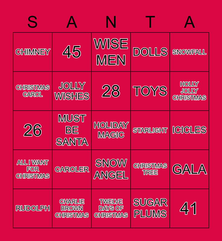 This bingo card has 300 words: has yet to finish Christmas shopping, Holiday, ALL I WANT FOR CHRISTMAS, ANGEL, TOYS, Cheer, will celebrate more than one christmas, CAMEL, BELLS, BIRTH, STAR, BLESSING, BLUE CHRISTMAS, BOWS, BUFFET DINNER, BUSY ELVES, Family, CANDLES, CANDY CANE, CAROL, CAROL OF THE BELLS, CAROLER, Christmas cookies, making a New Year's resolution, CHARLIE BROWN CHRISTMAS, CHEER, CHESTNUTS, CHIMNEY, CHIPMUNK CHRISTMAS, CHISTMAS SALES, CHRISTMAS, CHRISTMAS CARD, CHRISTMAS CAROL, CHRISTMAS COOKIE, CHRISTMAS DAY, CHRISTMAS DINNER, CHRISTMAS EVE, CHRISTMAS FOR COWBOYS, CHRISTMAS FUTURE, CHRISTMAS GIFT, CHRISTMAS LIGHTS, CHRISTMAS MIRACLE, CHRISTMAS MONEY, CHRISTMAS MORNING, CHRISTMAS PAGEANT, CHRISTMAS PLAY, CHRISTMAS PRESENT, CHRISTMAS STAR, CHRISTMAS STORY, CHRISTMAS TREE, CHRISTMAS WISH, CRANBERRY SAUCE, DECEMBER, DECEMBER 25TH, DECK THE HALLS, DECORATIONS, DO YOU HEAR WHAT I HEAR?, DOLLS, DR. SEUSS’ HOW THE GRINCH STOLE CHRISTMAS, DRESSING, DRUMMER BOY, EGGNOG, ELF, ELF, ELVES, ERNEST SAVES CHRISTMAS, FAMILY, FAMILY GATHERING, FAMILY REUNION, FEAST, FELIZ NAVIDAD, FESTIVAL, FIGGY PUDDING, FIR, FIRST NOEL, FRESH SNOWFALL, FROSTY, FROSTY RETURNS, FROSTY THE SNOWMAN, FROSTY’S WINTER WONDERLAND, FRUITCAKE, GALA, GATHERING, GIFT BOXES, GIFT EXCHANGE, GIFT LIST, GIFTS, GINGERBREAD HOUSE, GLAD TIDINGS, GOOD LUCK CHARLIE, IT’S CHRISTMAS! (2011), GOODWILL, GRANDMA GOT RUN OVER BY A REINDEER, GREATEST GIFT OF ALL, GREETINGS, GRINCH, HALLELUJAH CHORUS, HARK! THE HERALD ANGELS SING, HAVE YOURSELF A MERRY LITTLE CHRISTMAS, HOLIDAY, HOLIDAY CELEBRATION, HOLIDAY CHEER, HOLIDAY CLASSIC, HOLIDAY FAVORITE, HOLIDAY GALA, HOLIDAY GREETINGS, HOLIDAY MAGIC, HOLIDAY PARTY, HOLIDAY SPIRIT, HOLIDAY TIDINGS, HOLIDAY TRADITION, HOLLY, HOLLY JOLLY CHRISTMAS, HOME, HOME ALONE, I SAW MOMMY KISSING SANTA CLAUS, ICICLES, I'LL BE HOME FOR CHRISTMAS, IT’S A VERY MERRY MUPPET CHRISTMAS MOVIE, IT’S A WONDERFUL LIFE, IT'S BEGINNING TO LOOK LIKE CHRISTMAS, IT'S THE MOST WONDERFUL TIME OF THE YEAR, JACK FROST, JINGLE BELL ROCK, JINGLE BELLS, JOLLY WISHES, JOY, JOY TO THE WORLD, KRISS KRINGLE, LET IT SNOW, LETTER TO SANTA, LUMP OF COAL, MARY, MASS, MENORAH, MICKEY’S CHRISTMAS CAROL, MIDNIGHT SERVICE, MINCE PIE, MIRACLE, MIRACLE OF CHRISTMAS, MIRACLE ON 34TH STREET, MISTLETOE, MR. GRINCH, MRS. CLAUS, MUPPET FAMILY CHRISTMAS, MUST BE SANTA, NATIONAL LAMPOON’S CHRISTMAS VACATION, NATIVITY SCENE, NOEL, NUTCRACKER, O CHRISTMAS TREE, O COME, ALL YE FAITHFUL, O HOLY NIGHT, OFFICE CHRISTMAS PARTY, ORNAMENT, OVER THE RIVER AND THROUGH THE WOODS, PARADE, PEACE, PEACE DOVE, NORTH POLE, PEPPERMINT, PINE, PLUMS, POINSETTIA, PRAYER, PRESENTS, REINDEER, RIBBON, ROARING FIRE, ROCKING AROUND THE CHRISTMAS TREE, ROOFTOP, RUDOLPH, SALES, SANTA, SANTA BABY, SANTA CLAUS IS COMIN’ TO TOWN, SANTA'S BAG, SANTA'S ELVES, SANTA'S LIST, SANTA'S SLEIGH, SANTA'S WORKSHOP, SCROOGE, SEASON, SEASON'S GREETINGS, SECRET SANTA, SERVICE, SHEPHERD, SHOPPING, SHREK THE HALLS, SILENT NIGHT, SILVER BELLS, SLED, SLEIGH, SLEIGH BELLS, SLEIGH RIDE, SNOW, SNOW ANGEL, SNOWFALL, SNOWFLAKE, SNOWMAN, SPIRIT, ST. NICK, STAR, STARLIGHT, STOCKING, STOCKING STUFFER, STROKE OF MIDNIGHT, SUGAR PLUMS, THE ENCHANTED CHRISTMAS, THE MUPPET CHRISTMAS CAROL, THE NIGHT BEFORE CHRISTMAS, THIS IS THAT TIME OF THE YEAR, TIDING, TINSEL, TOYS, TRADITION, TREE STAND, TRIMMINGS, TRUMPETS, TURKEY, TWAS THE NIGHT BEFORE CHRISTMAS, TWELVE DAYS OF CHRISTMAS, UP ON THE HOUSETOP, VISIONS OF SUGARPLUMS, WE WISH YOU A MERRY CHRISTMAS, WHITE CHRISTMAS, WINTER, WINTER WONDERLAND, WISE MEN, WRAPPING PAPER, WREATH, XMAS, YOUR HOLIDAY BEST, YULE LOG, 1, 2, 3, 4, 5, 6, 7, 8, 9, 10, 11, 12, 13, 14, 15, 16, 17, 18, 19, 20, 21, 22, 23, 24, 25, 26, 27, 28, 29, 30, 31, 33, 34, 35, 36, 37, 38, 39, 40, 41, 42, 32, 43, 44, 45, 46, 47, 48, 49, 50, 51, 52, 53, 54, 55, 56, 57, 58, 59, 60, 61, 62, 63, 64, 65, 66 and 67.