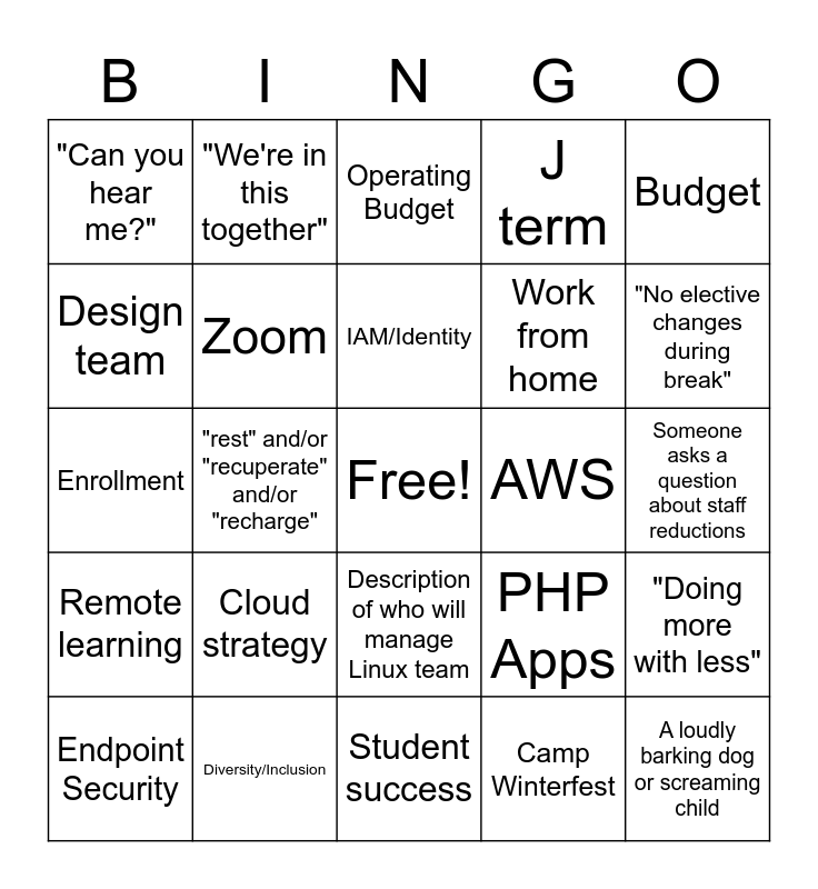 This bingo card has a free space and 24 words: Cloud strategy, Diversity/Inclusion, IAM/Identity, Endpoint Security, Budget, "Can you hear me?", Design team, "We're in this together", AWS, Description of who will manage Linux team, Work from home, Enrollment, PHP Apps, "Doing more with less", Zoom, Camp Winterfest, Someone asks a question about staff reductions, Operating Budget, "No elective changes during break", "rest" and/or "recuperate" and/or "recharge", A loudly barking dog or screaming child, Remote learning, J term and Student success.