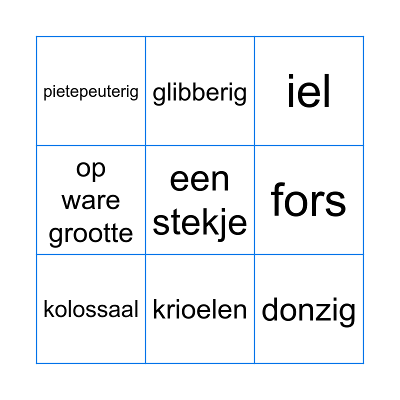 This bingo card has a free space and 8 words: fors, iel, glibberig, kolossaal, pietepeuterig, donzig, op ware grootte and krioelen.
