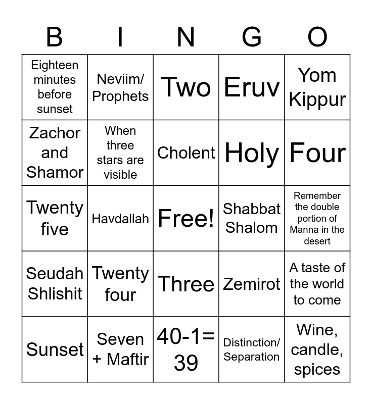 This bingo card has a free space and 29 words: Sunset, Creation & Exodus from Egypt, Havdallah, A bride and a queen, Eighteen minutes before sunset, Two, When three stars are visible, Twenty four, Shabbat Shalom, Seven + Maftir, Remember the double portion of Manna in the desert, Wine, candle, spices, 40-1= 39, Distinction/ Separation, Four, Kiddush, Three, Seudah Shlishit, Yom Kippur, Twenty five, Zemirot, Seven, Holy, Zachor and Shamor, Eruv, Neviim/ Prophets, A taste of the world to come, Cholent and Moshiach will come.