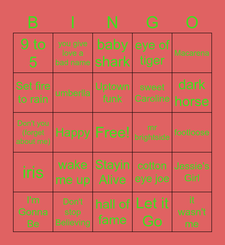This bingo card has a free space and 26 words: Stayin Alive, Let it Go, Uptown funk, Don't stop Believing, Macarena, 9 to 5, Set fire to rain, you give love a bad name, footloose, cotton eye joe, sweet Caroline, Don't you (forget about me), Jessie's Girl, I'm Gonna Be, Happy, I want it that way, eye of tiger, iris, baby shark, it wasn't me, dark horse, hall of fame, mr brightside, wake me up, umberlla and stronger.
