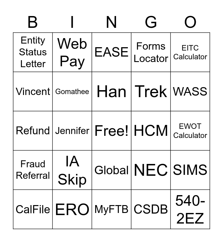 This bingo card has a free space and 45 words: 199N ePostcard, 540-2EZ, BE eFile Waiver, CalFile, CAPTCHA, CSDB, EASE, eDemand, EITC Calculator, ERO, Forms Locator, HCM, Global, IA Skip, MyCOD, MyFTB, PIT Bill Delay, Refund, VITA, WASS, Web Pay, ARM Dashboard, Email Apps, Entity Status Letter, Event Calendar, EWOT Calculator, Opt-In, Mobile App, NEC, Fraud Referral, POA, SIMS, Online Tax Calculator, Request / Demand for Tax Return, Kathi, Jennifer, Katelyn, Hiba, Sheila, Han, Vincent, Trek, Sherry, Gomathee and EJ.