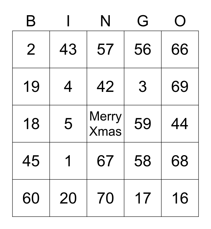 This bingo card has a free space and 24 words: 1, 20, 42, 60, 66, 2, 19, 43, 59, 67, 3, 18, 58, 68, 4, 17, 44, 57, 69, 5, 16, 45, 56 and 70.
