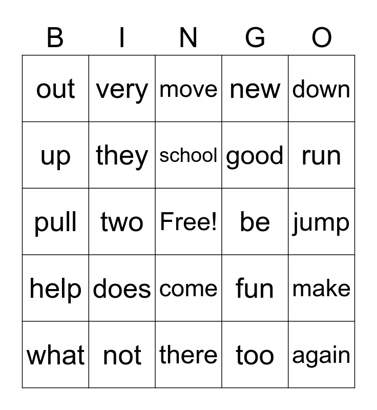 This bingo card has a free space and 24 words: does, not, school, what, down, out, up, very, be, come, good, pull, fun, make, they, too, jump, move, run, two, again, help, new and there.