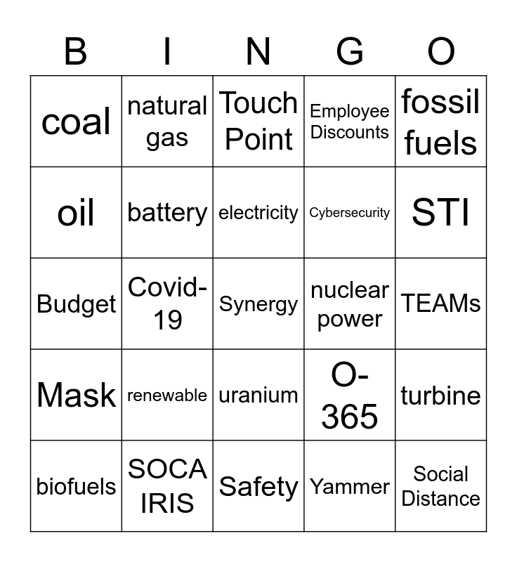 This bingo card has 25 words: renewable, Safety, electricity, biofuels, fossil fuels, coal, oil, natural gas, nuclear power, uranium, Cybersecurity, Budget, O-365, turbine, battery, Social Distance, TEAMs, Touch Point, STI, Covid-19, Synergy, SOCA IRIS, Mask, Employee Discounts and Yammer.