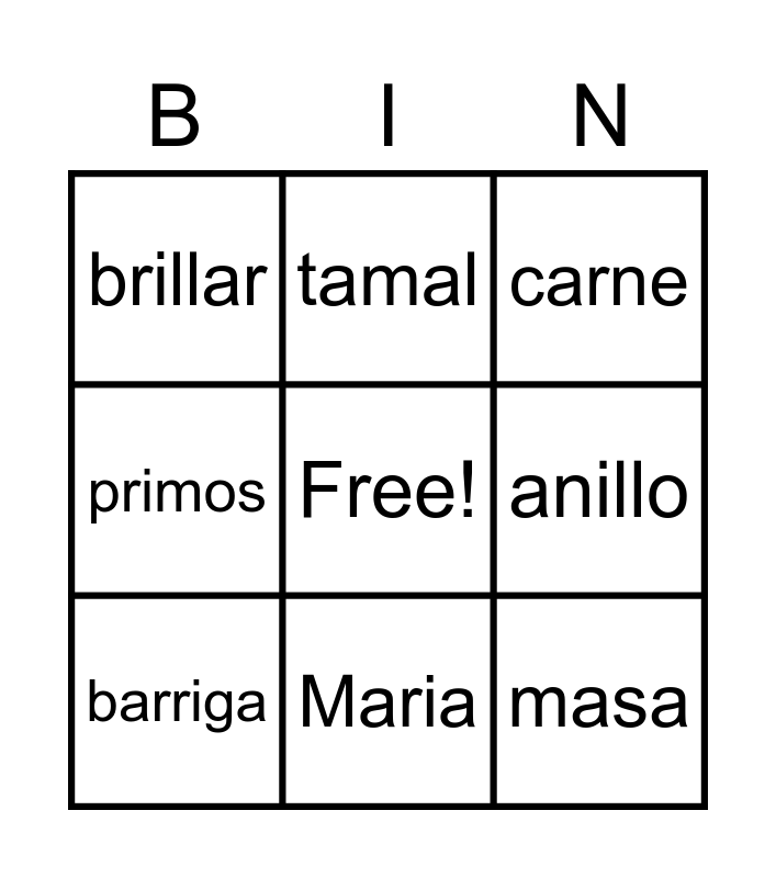 This bingo card has a free space and 8 words: anillo, carne, tamal, barriga, brillar, masa, primos and Maria.