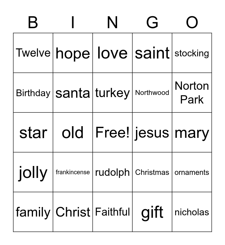 This bingo card has a free space and 39 words: tree, jingle, bells, santa, family, rudolph, turkey, max, stocking, jolly, old, saint, nicholas, mary, jesus, frankincense, Bethlehem, Twelve, Days, Christmas, Birthday, Faithful, Northwood, Norton Park, gold, myrrh, candles, advent, eve, hope, joy, peace, love, Christ, gift, goodwill, ornaments, star and Dolly Parton.