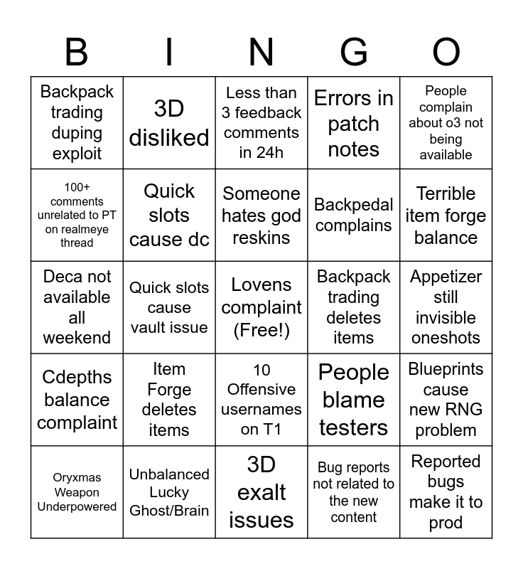This bingo card has a free space and 36 words: Item Forge duping exploit, Server crash, Backpack Trading doesn't work, Quick slots cause dc, People blame testers, Cdepths balance complaint, Someone hates god reskins, Oryxmas Weapon OP, People complain about o3 not being available, Item Forge doesn't work, Quick slots cause vault issue, Errors in patch notes, People want bug fixes instead, Backpack trading deletes items, Terrible item forge balance, Backpack trading duping exploit, "Item forge is p2w", Item Forge deletes items, Reported bugs make it to prod, Less than 3 feedback comments in 24h, Appetizer still invisible oneshots, Blueprints cause new RNG problem, Unbalanced Lucky Ghost/Brain, Oryxmas Weapon Underpowered, 3D exalt issues, 3D disliked, Deca not available all weekend, People don't read the changelog at all, Backpedal complains, 100+ comments unrelated to PT on realmeye thread, Testers get angry at Deca, Something completely unrelated to the changes breaks, Bug reports not related to the new content, 10 Offensive usernames on T1, Lost Halls gets disabled and Old player complains about old sprites changed.