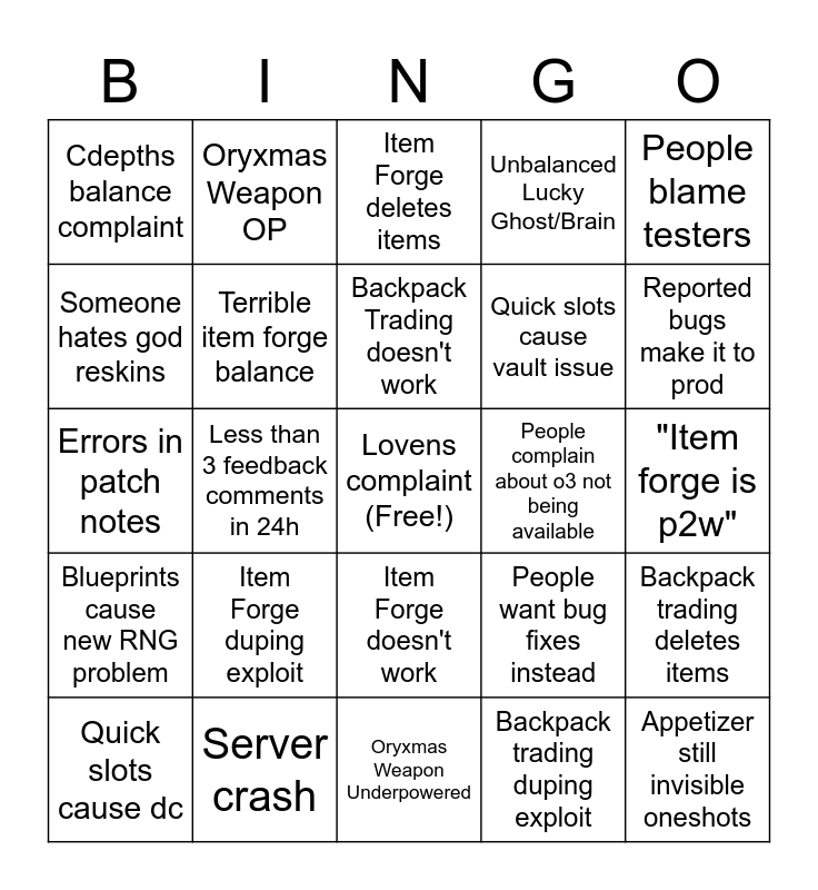 This bingo card has a free space and 24 words: Item Forge duping exploit, Server crash, Backpack Trading doesn't work, Quick slots cause dc, People blame testers, Cdepths balance complaint, Someone hates god reskins, Oryxmas Weapon OP, People complain about o3 not being available, Item Forge doesn't work, Quick slots cause vault issue, Errors in patch notes, People want bug fixes instead, Backpack trading deletes items, Terrible item forge balance, Backpack trading duping exploit, "Item forge is p2w", Item Forge deletes items, Reported bugs make it to prod, Less than 3 feedback comments in 24h, Appetizer still invisible oneshots, Blueprints cause new RNG problem, Unbalanced Lucky Ghost/Brain and Oryxmas Weapon Underpowered.