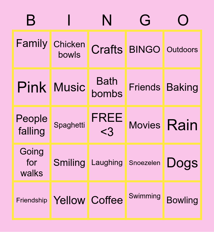 This bingo card has a free space and 24 words: Smiling, Yellow, Bath bombs, Friendship, Outdoors, Family, Pink, Chicken bowls, Movies, Laughing, Friends, People falling, Snoezelen, Dogs, Music, Swimming, Rain, Crafts, Baking, Spaghetti, Bowling, Going for walks, BINGO and Coffee.