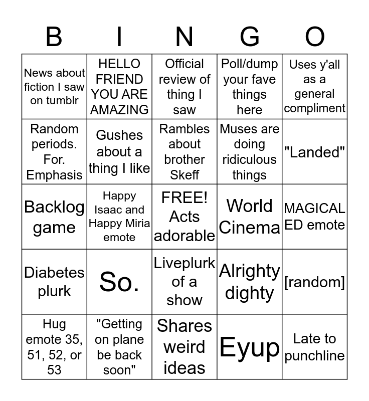 This bingo card has a free space and 24 words: So., "Getting on plane be back soon", Rambles about brother Skeff, Hug emote 35, 51, 52, or 53, Uses y'all as a general compliment, News about fiction I saw on tumblr, Random periods. For. Emphasis, HELLO FRIEND YOU ARE AMAZING, World Cinema, Liveplurk of a show, Muses are doing ridiculous things, Backlog game, Alrighty dighty, [random], Gushes about a thing I like, Eyup, MAGICAL ED emote, Official review of thing I saw, "Landed", Happy Isaac and Happy Miria emote, Late to punchline, Diabetes plurk, Poll/dump your fave things here and Shares weird ideas.