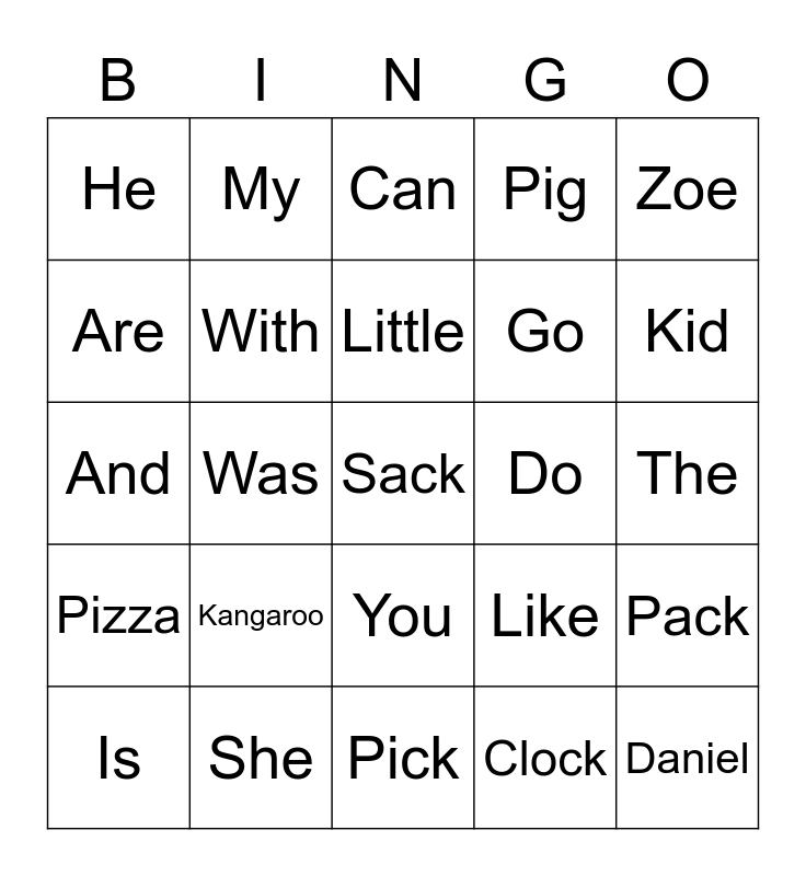 This bingo card has a free space and 24 words: Kangaroo, She, Little, Is, Zoe, He, Are, My, Do, You, Go, And, Like, Pack, With, Clock, The, Can, Kid, Was, Daniel, Pizza, Pig and Pick.